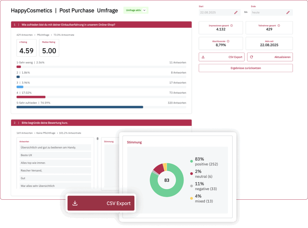 Du möchtest lieber ein Auge auf die Ergebnisse haben? Dank Echtzeit-Auswertungen kannst du zu jederzeit in dein Dashboard schauen und bist sofort auf dem neusten Stand!