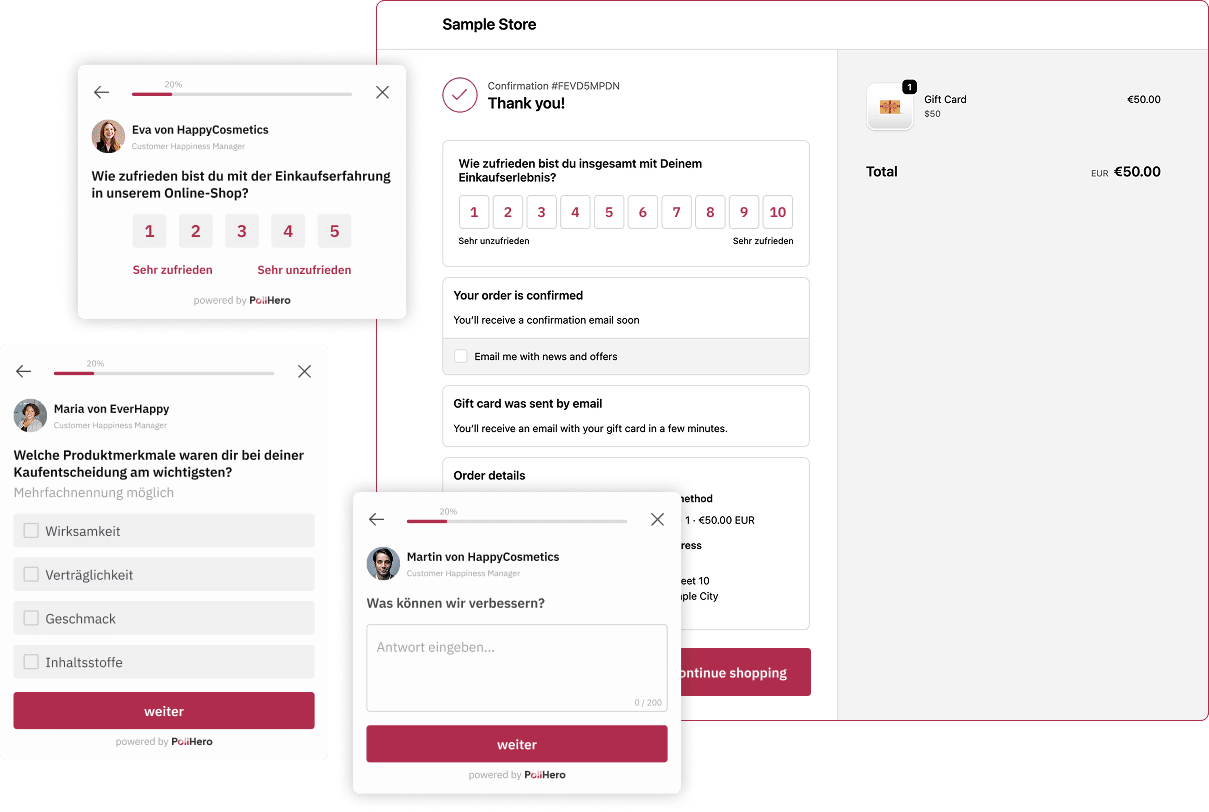 Durch Onsite-Survey kannst du wichtiges Feedback über deine Website und deine Kundschaft erhalten. Von der Kundenzufriedenheit über UX & UI Entscheidungen bis hin zur Rückmeldung über deinen Support: Die Umfrageergebnisse helfen dir dabei, deiner Kundschaft Gehör zu schenken, Probleme auszubessern und so deine Website zu verbessern, Bestellungen zu steigern und deinen Umsatz zu erhöhen.