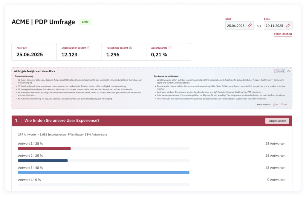 Filter dein Reporting gezielt nach Attributen (z.B. Neukundschaft, Premium-Membership, Hundebesitzerin, etc.) und entdecke vorher unbekannte Zusammenhänge innerhalb der Antworten