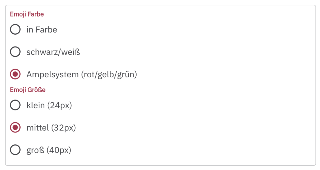 schwarz/weiß bedeutet in diesem Fall, dass die Emojis in der Schriftfarbe der Umfrage ausgespielt werden, wohingegen du unter „in Farbe“ eine andere Farbe wählen kannst.