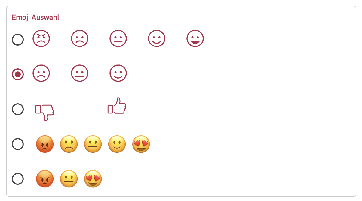 • Außerdem kannst du zwischen zwei Sets mit jeweils drei Smileys aus drei Smileys, einem Set mit fünf Smileys und einem Set aus zwei Daumen (Daumen hoch, Daumen runter) wählen.