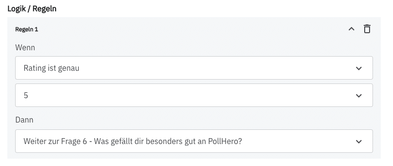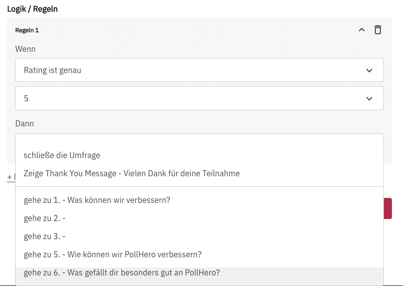 In meinem Fall möchte ich einstellen, dass alle, die PollHero mit 5 Sternen bewerten, Frage 6 ausgespielt bekommen.