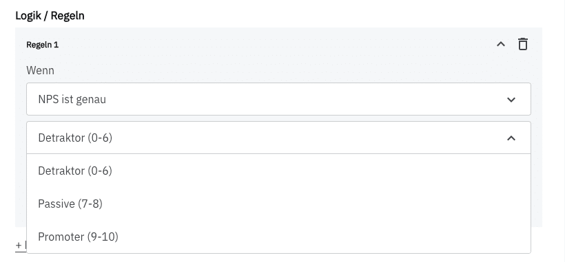 Im Prinzip funktioniert die Logik der Net Promoter Score Frage gleich. Der einzige Unterschied ist, dass du die Spannweite der Antworten nicht selbst auswählen kannst. Diese ist beim NPS durch die Detraktor/Passive/Promoter-Dreiteilung vorgegeben:
