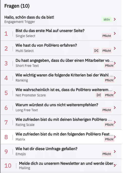 Hier siehst du außerdem, ob eine Frage eine Pflichtfrage ist. Steht hinter eine Frage nichts, ist die Frage keine Pflichtfrage.