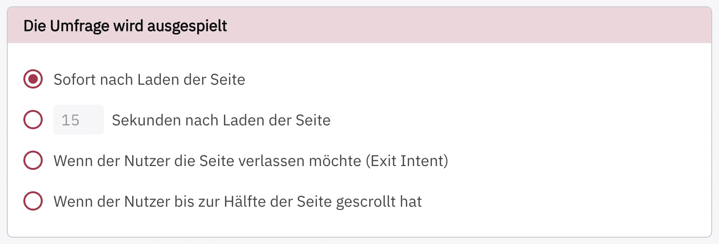 In der Sektion „die Umfrage wird ausgespielt“ kannst du entscheiden, wann deine Umfrage ausgespielt werden soll. Du hast vier Optionen: