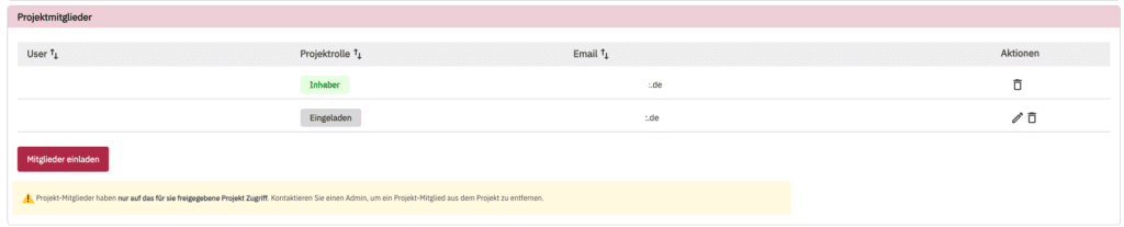 Du kannst Mitarbeitende als Mitglieder zum Projekt einladen. Die Mitglieder haben nur Zugriff auf dieses Projekt und nicht auf andere Projekte, die du in deinem Account hast. So kannst du zum Beispiel deine Kundschaft nur für ihr eigenes Projekt einladen.