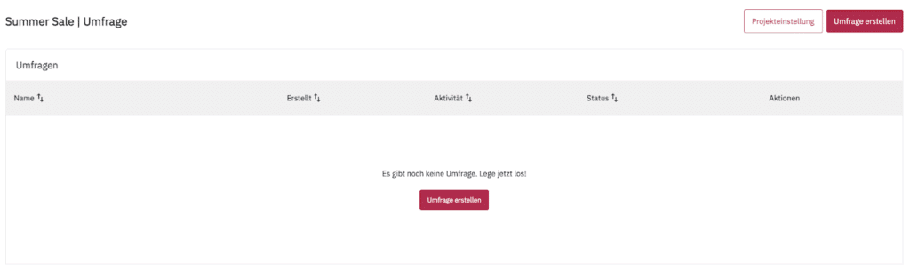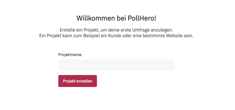 Um dein erstes Projekt zu erstellen, gib einfach den Projektnamen ein und klicke auf Projekt erstellen. Du kommst zur Übersicht deiner Umfragen. Jedes Projekt kann mehrere Umfragen haben.