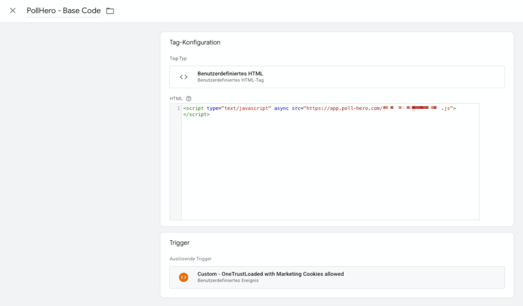 Um PollHero über Google Tag Manager oder einen anderen Anbieter zu installieren, kopiere den Tracking-Code und erstelle im Google Tag Manager einen neuen Tag vom Typ “Benutzerdefiniertes HTML”.