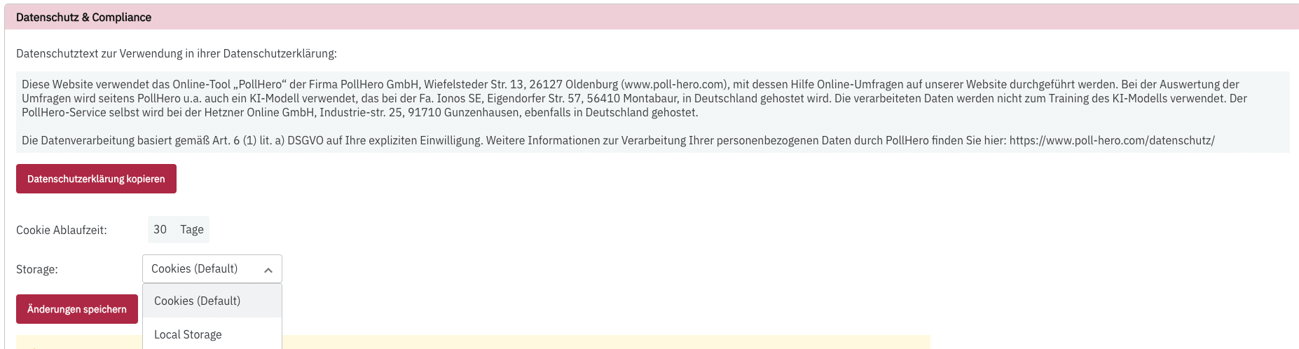 Außerdem kannst du einstellen, wie und wie lange Daten gespeichert werden. Daten werden entweder als Cookies oder im Local Storage gespeichert. Standardmäßig speichert PollHero Daten in Cookies.