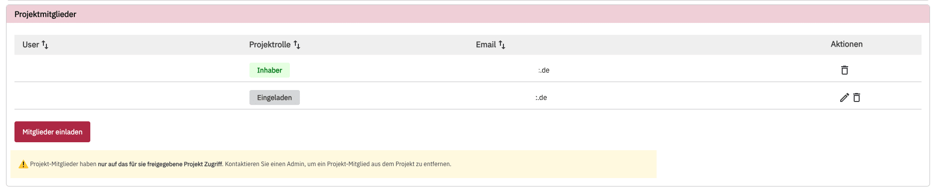 Du kannst Mitarbeitende als Mitglieder zum Projekt einladen. Die Mitglieder haben nur Zugriff auf dieses Projekt und nicht auf andere Projekte, die du in deinem Account hast. So kannst du zum Beispiel deine Kundschaft nur für ihr eigenes Projekt einladen.