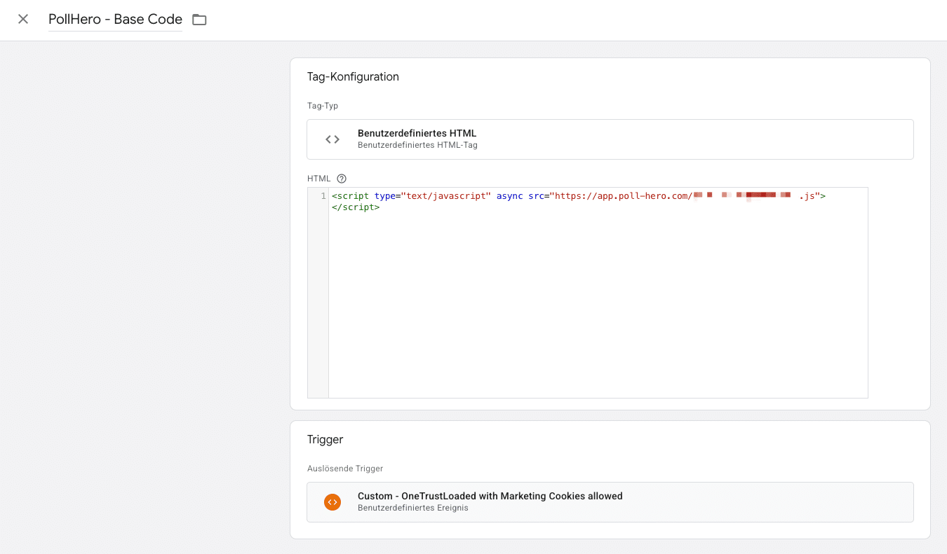 Um PollHero über Google Tag Manager oder einen anderen Anbieter zu installieren, kopiere den Tracking-Code und erstelle im Google Tag Manager einen neuen Tag vom Typ “Benutzerdefiniertes HTML”.