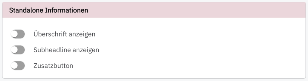 In den Stand Alone Informationen kannst du einstellen, ob deine Umfrage eine Überschrift haben soll. Die Überschrift kann zum Beispiel den Zweck deiner Umfrage sein, etwa „Mitarbeitendenumfrage 2026“ oder „Umfrage Weihnachtsaktion Nov/Dez“.