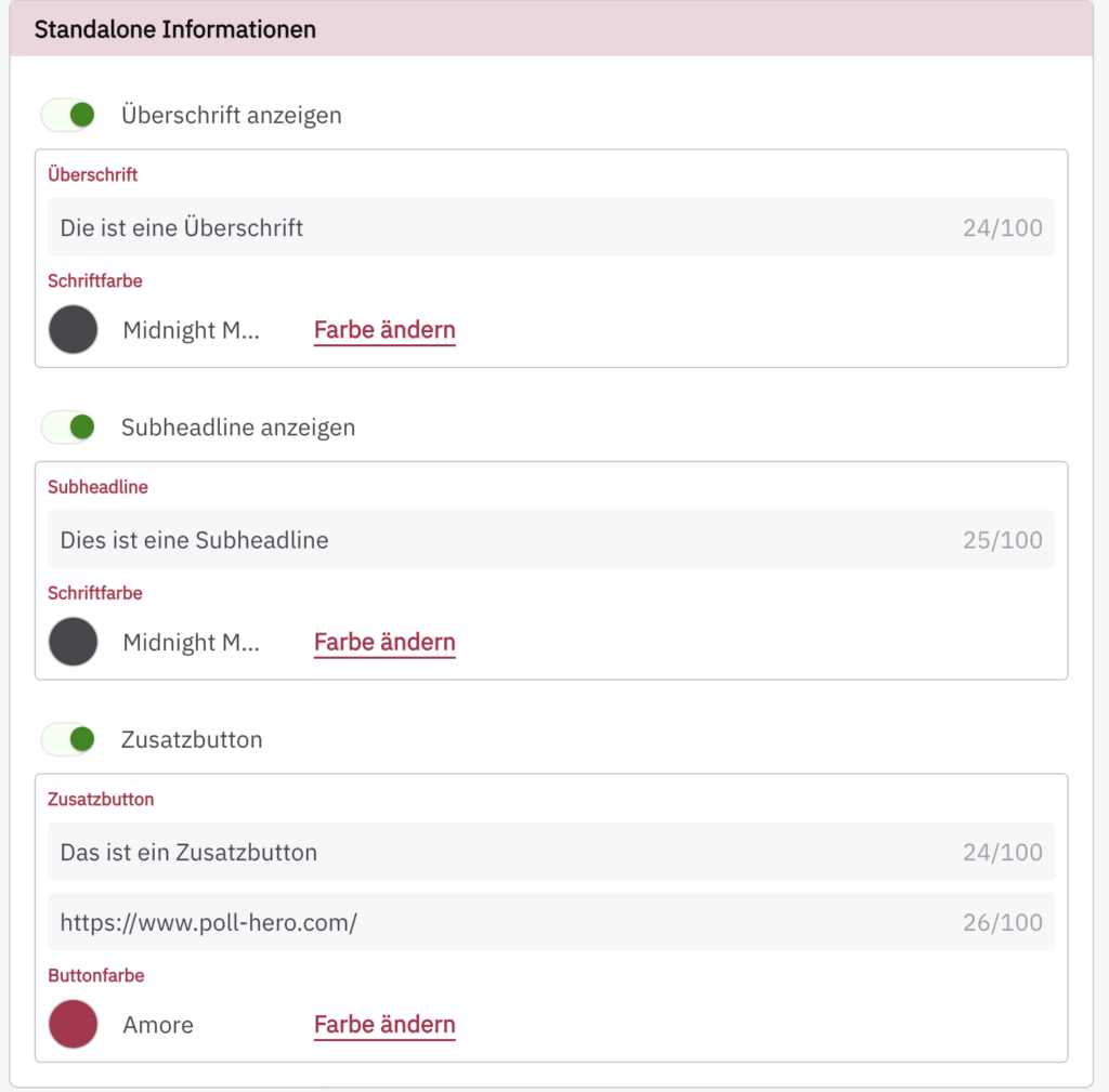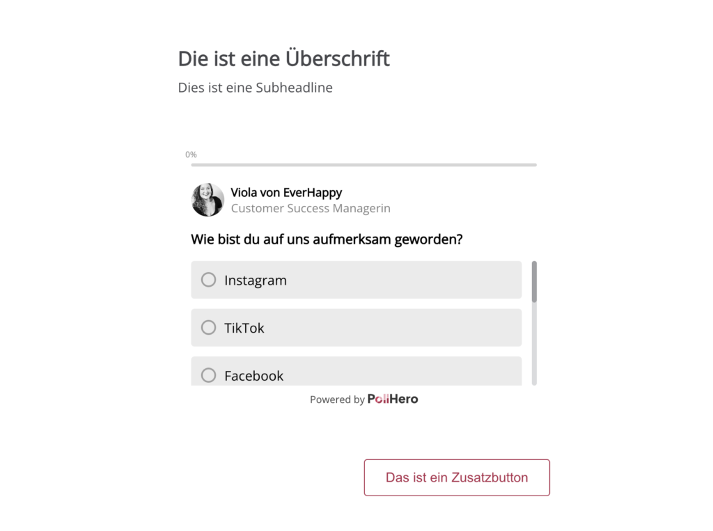 Die Subheadline wird unter der Überschrift eingeblendet. Der Zusatzbutton wird am unteren Ende der Umfrage angezeigt. Du kannst zu einer externen Seite verlinken, etwa zu deinen Datenschutzbestimmungen oder Gewinnspielbedingungen.