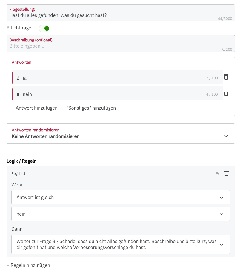 Stelle dazu am besten eine Single Select Frage. Antwortet dein User mit „Ja“, kannst du dich für die Teilnahme bedanken und die Umfrage beenden. Antwortet dein User mit „Nein“, kannst du eine Freitext-Folgefrage stellen. Was haben sie vermisst?