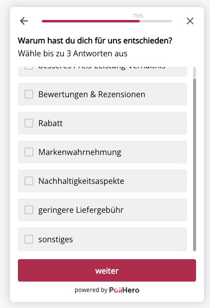 In einer Post Purchase Umfrage kannst du nach einer erfolgreichen Transaktion fragen, ob, und wenn ja welche, weiteren Marken deine Kundschaft vor dem Kauf bei dir in Betracht gezogen haben.