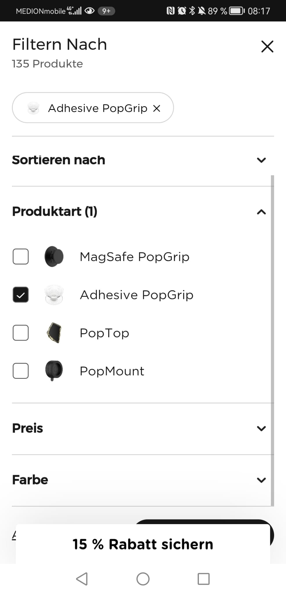 Die User Experience im PopSocket Store ist für Mobile User frustrierend, da der Rabatt-Button den Filter-Button versteckt und Nutzer so nur schwer filtern können.